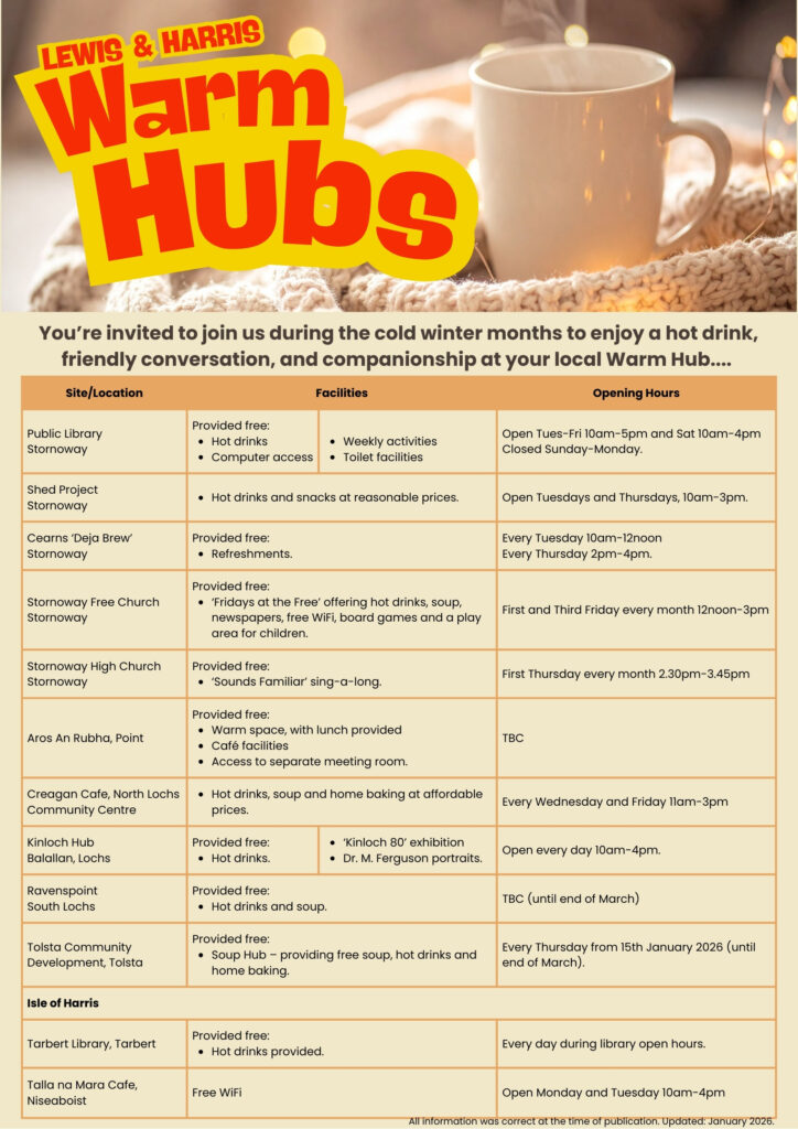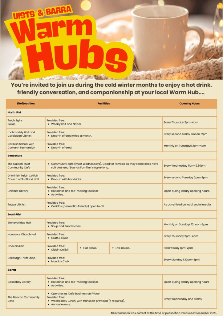 Across the Western Isles there are welcoming places and activities where people can enjoy a hot drink, friendly conversation, and companionship. Many of these spaces are free, and can be found in community centres, libraries, churches or other suitable local venues. They can offer a warming bowl of soup, a hot drink or snack in a friendly environment whilst also letting people catch-up with the local news.