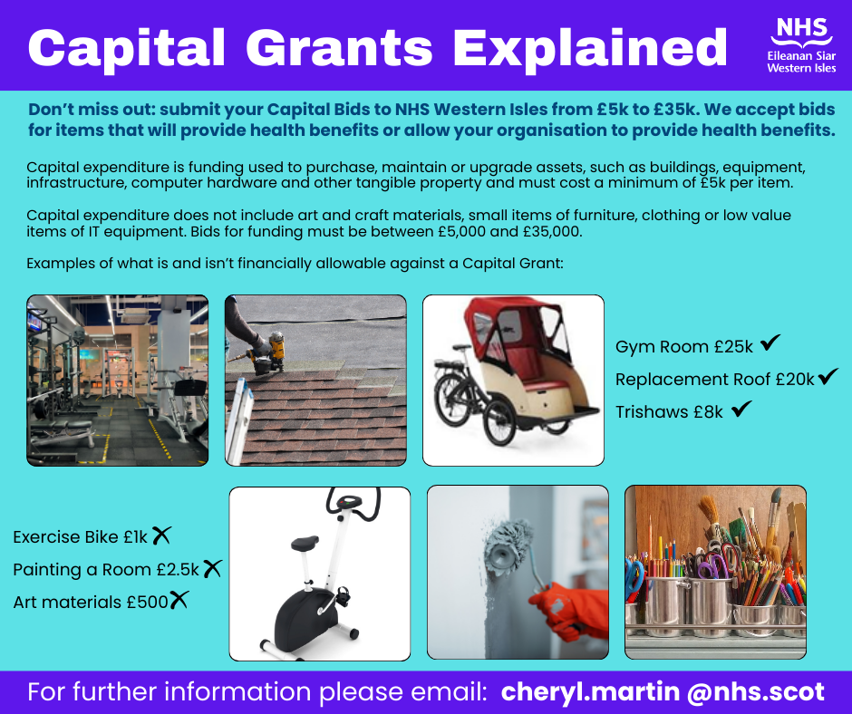NHS Western Isles is reminding organisations in the Western Isles to submit bids for capital grant funding before 31st January 2026.