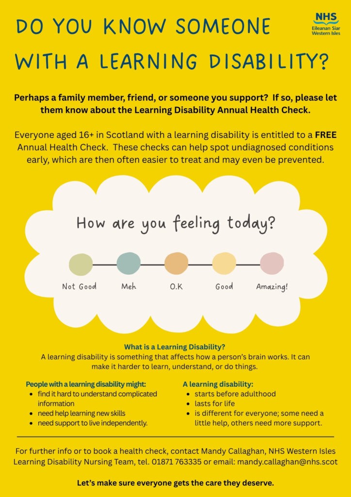 If you have not yet been called for your annual Health Check, or if you have any questions, please contact Mandy Callaghan, Community Learning Disability Nursing Team, NHS Western Isles, tel. 01851 763335 or email mandy.callaghan@nhs.scot