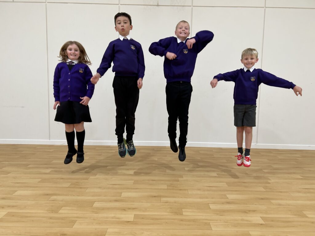Pictured are (in no order): Danny Maclean (GL7), Ayla Lonie (GM4), Nathan Barker (GL3) and George Murray (GM5), children from Laxdale School jumping for joy on the new Games Hall flooring.