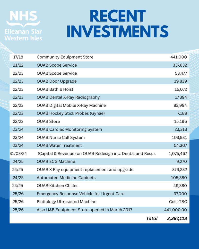 The full capital programme included the development of a new resuscitation/stabilisation room as part of the ward area. The work is now complete and this purpose-built area, includes a portable ventilator for respiratory support pre-transfer. There are no substantive anaesthetists based in Ospadal Uibhist agus Bharraigh so the reference to the ‘loss’ of an anaesthetic machine is somewhat irrelevant in the context of current service provision.