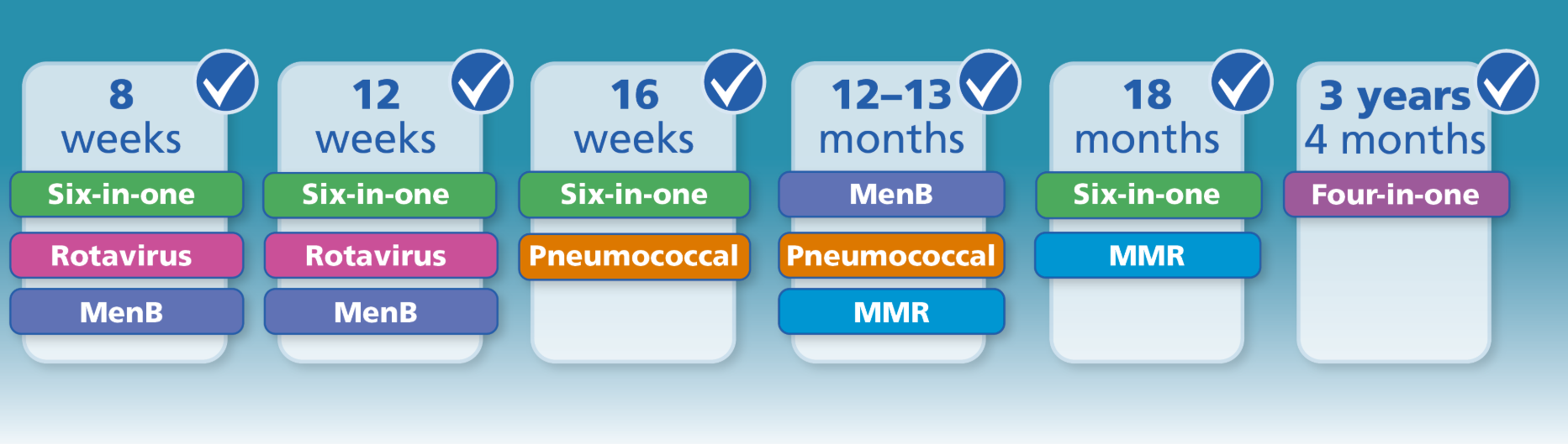 - 4-in-1 vaccine – helps protect your child against diptheria, tetanus, whooping cough and polio